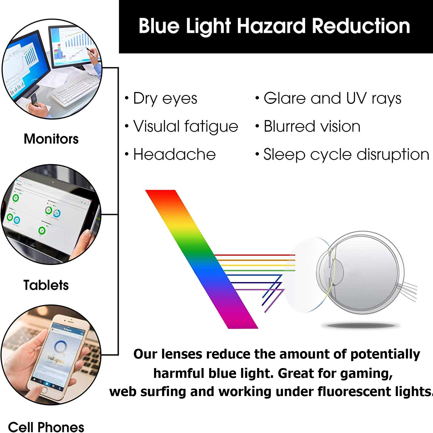 Exposing your eyes to the blue light coming from smartphone, PC and TV screens can lead to fatigue, stress, headaches and prevent you from a restful sleep.